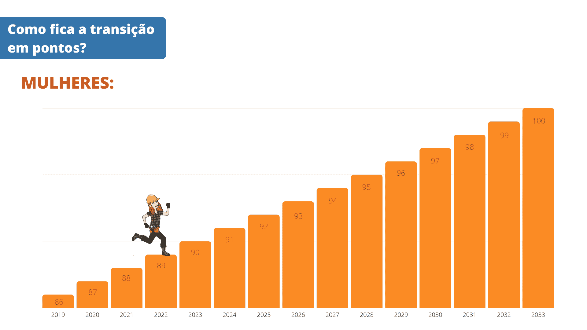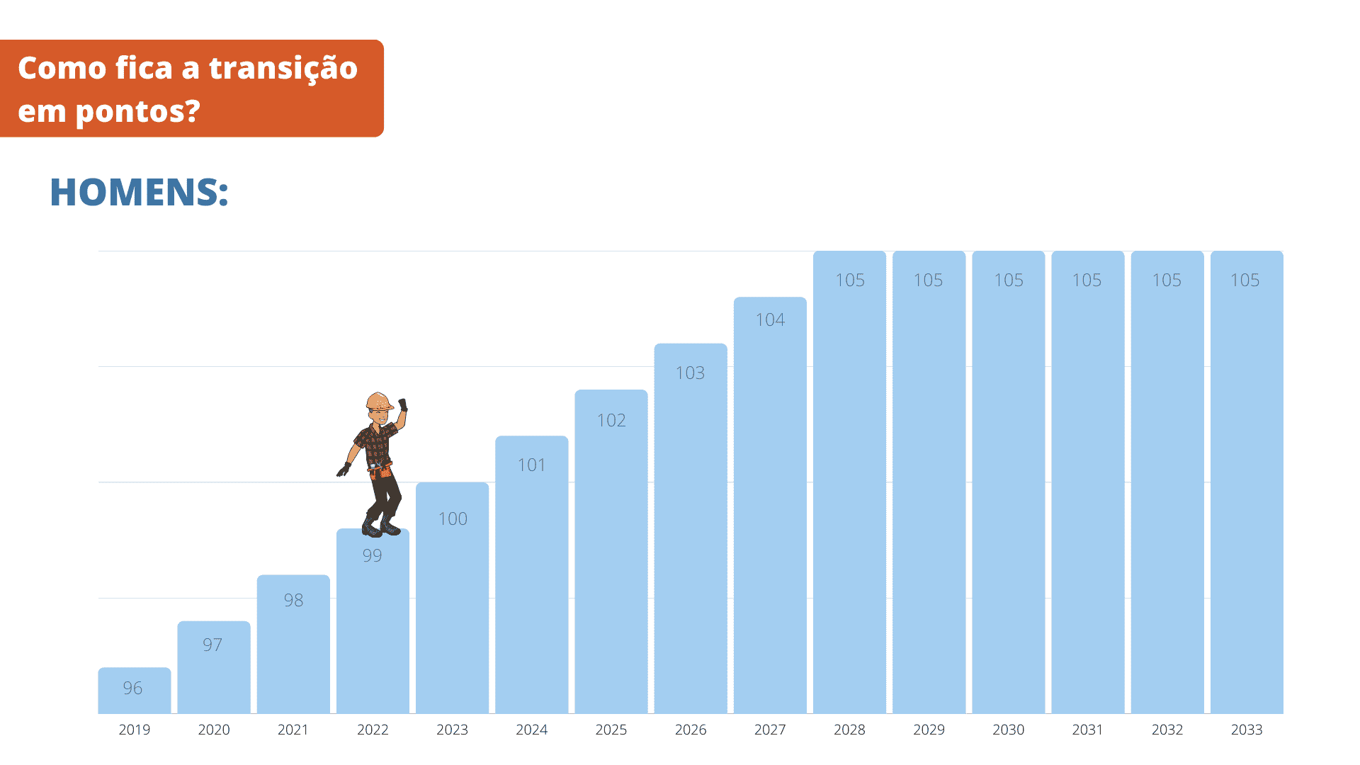 O requisito de pontos será acrescido de 1 ponto a cada ano, a partir de 01/01/2020, até atingir 100 pontos para mulheres e 105 pontos para homens, conforme o infográfico abaixo: