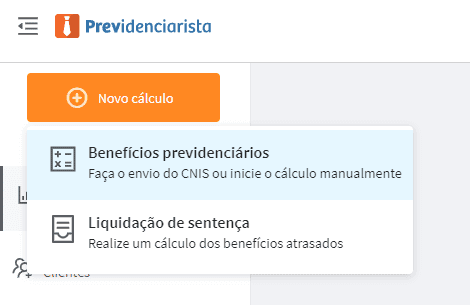 Então para iniciar você vai em “Novo cálculo” e depois em “Benefícios previdenciários”.