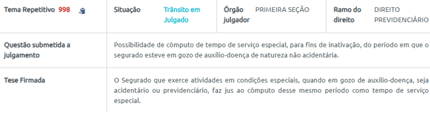 Até mesmo o benefício por incapacidade que é recebido no curso de um contrato de trabalho reconhecido como especial, terá sua contagem majorada, conforme foi decidido no Tema 998 do STJ: