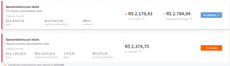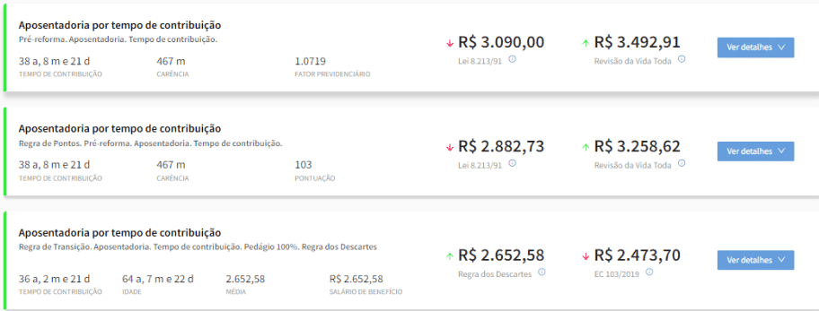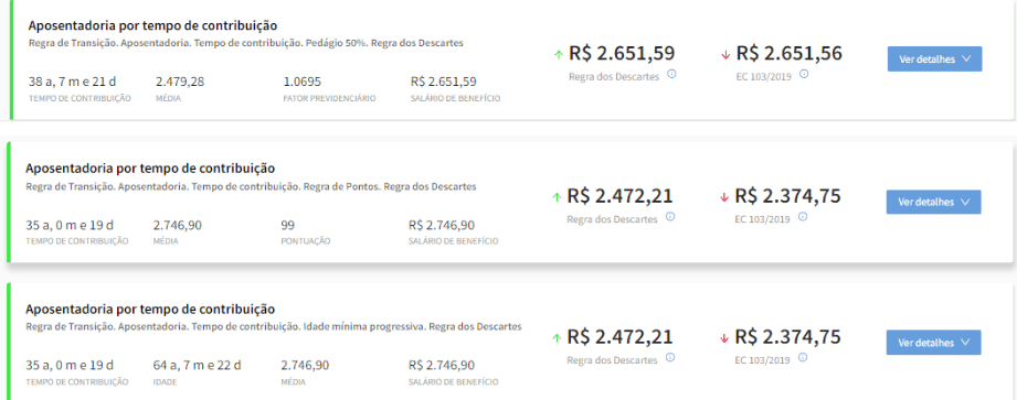 Assim, com apenas alguns cliques você terá em sua tela os resultados para TODOS os regramentos de aposentadoria: