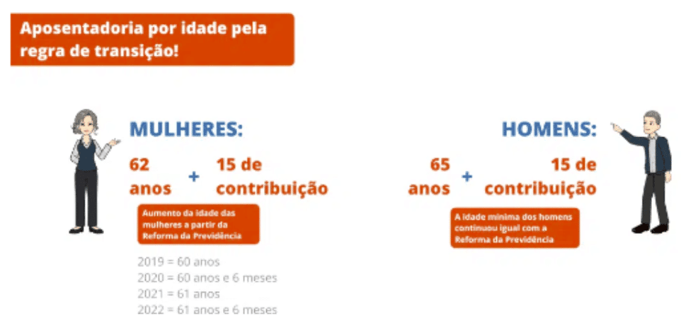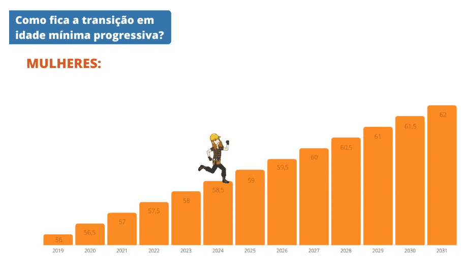 A partir da Reforma, houve o aumento do requisito de idade para as mulheres, de forma progressiva, da seguinte forma: