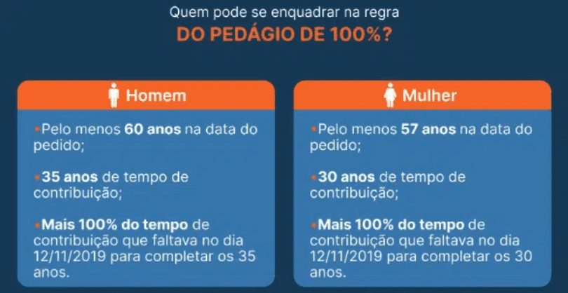 - Para melhor entendimento dos regramentos do Pedágio 50% e Pedágio 100%, inclusive com aplicação em casos práticos, por favor, acesse: Como calcular o tempo de pedágio para aposentadoria?