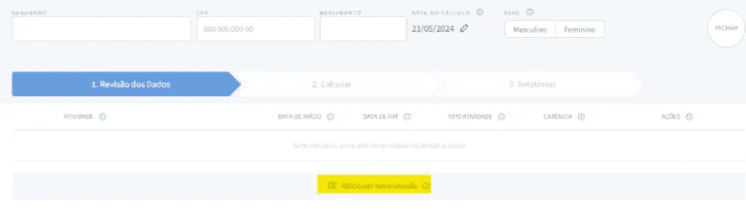 Caso deseje fazer um cálculo manual, ou seja, sem a utilização do CNIS digital, preencha os seus dados pessoais e, após, clique em “Adicionar novo vínculo” para informar as atividades laborativas.