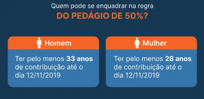 - Além dos 35 anos (homem) ou 30 anos (mulher), cumprir mais 50% (ou, metade) do tempo de contribuição que lhe faltava no dia 12/11/2019 para completar esses 35 anos (homem) / 30 anos (mulher).