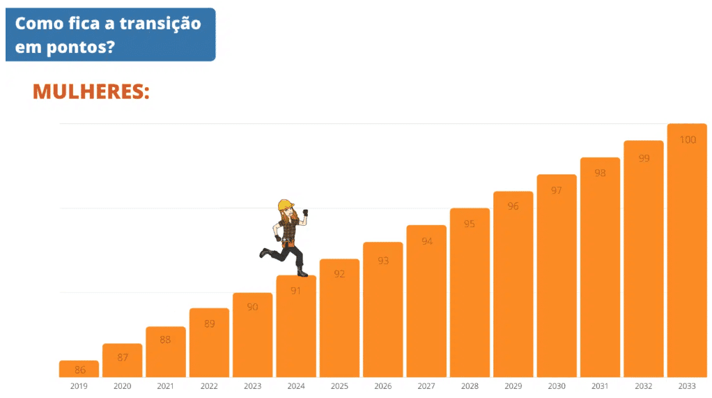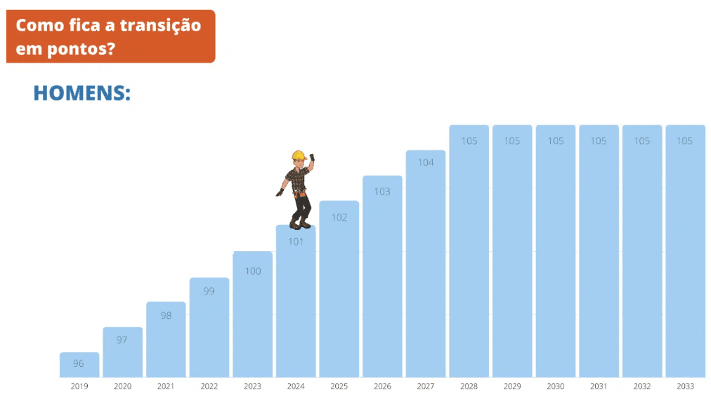 O requisito da pontuação mínima é acrescido de um ponto por ano, até o limite de 100 pontos para mulheres e 105 pontos para homens, passando a progredir da seguinte maneira: