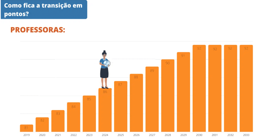 O requisito de pontuação é alterado a cada ano, com a adição de 1 por ano, a partir de 2020, até o limite de 92 pontos para mulheres (em 2030) e 100 para homens (em 2028), conforme tabela a seguir: