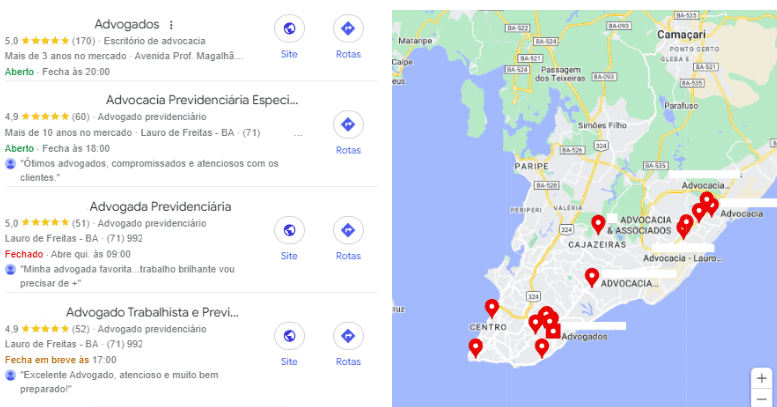 A diferença é que, através do Maps, você conseguirá visualizar a localização de cada advogado e escritório diretamente no mapa de sua cidade, além de ter acesso ao telefone de contato e horário de atendimento local.