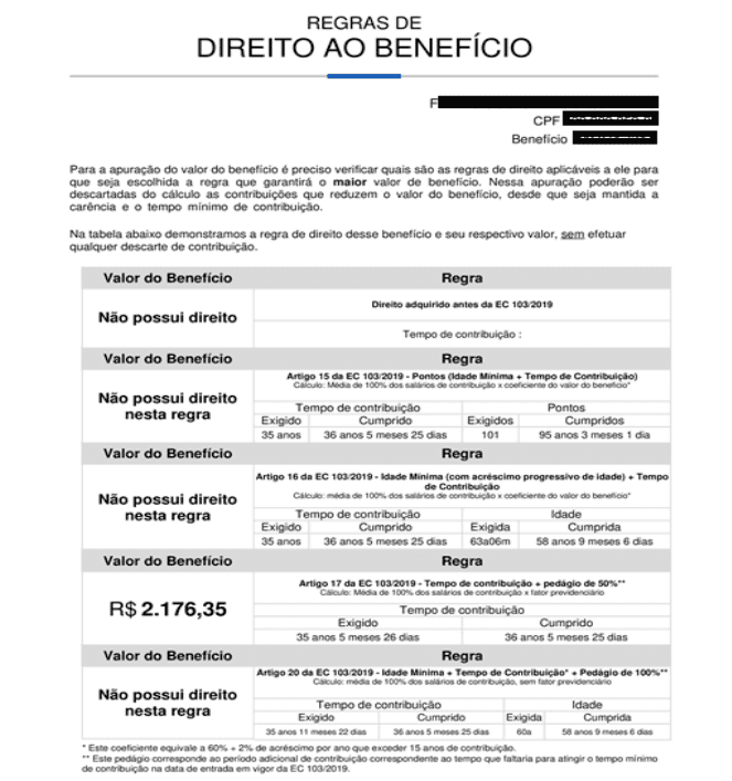 - Cálculo do benefício: detalha como o valor do benefício foi calculado, utilizando a média dos salários de contribuição corrigidos. Exemplo: “Cálculo de Benefícios segundo a Lei 9876/1999, média dos 80% maiores salários de contribuição”. OU alguma das regras de transição da EC-103-2019. Confira aqui a calculadora de aposentadoria.