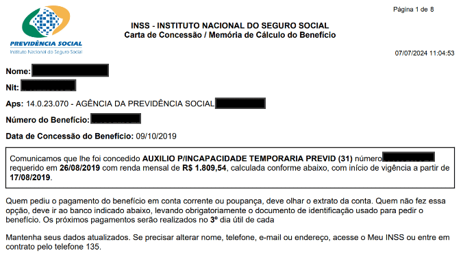 - Identificação do beneficiário: este ponto contém informações pessoais do beneficiário, como nome, CPF, NIT, e o número do benefício. Exemplo: “Nome: JOÃO DE SOUZA, NIT: 100123123-7”.