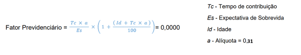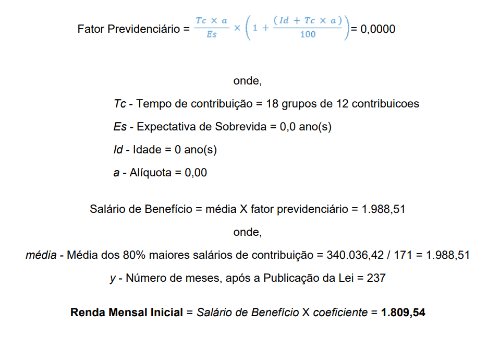 - Fator previdenciário: em alguns casos ainda se aplica uma fórmula que se utiliza no cálculo da renda mensal inicial. Exemplo: