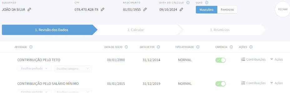 Nesse sentido, veja-se um exemplo prático de cálculo de benefício de Aposentadoria por Idade para segurado homem, através do sistema de cálculos do Prev.
