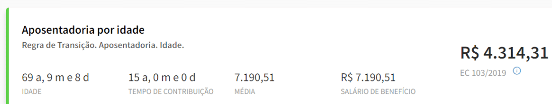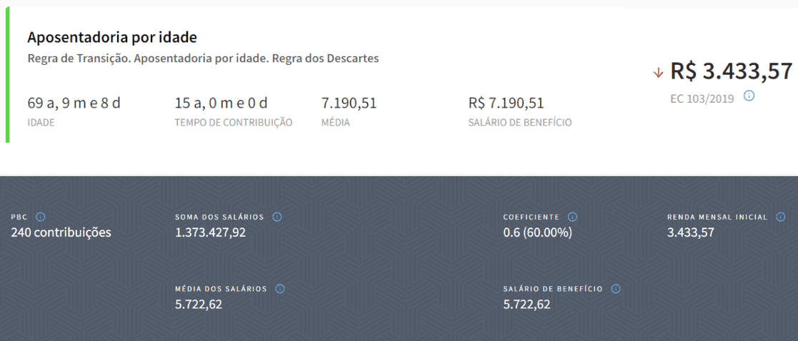 O resultado da Renda Mensal Inicial do benefício de Aposentadoria por Idade pela Regra de Transição da Reforma da Previdência SEM DESCARTES será de R$ 3.433,57: