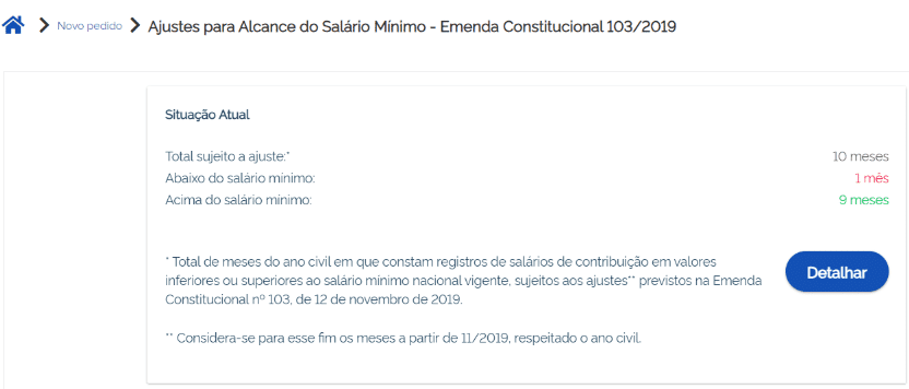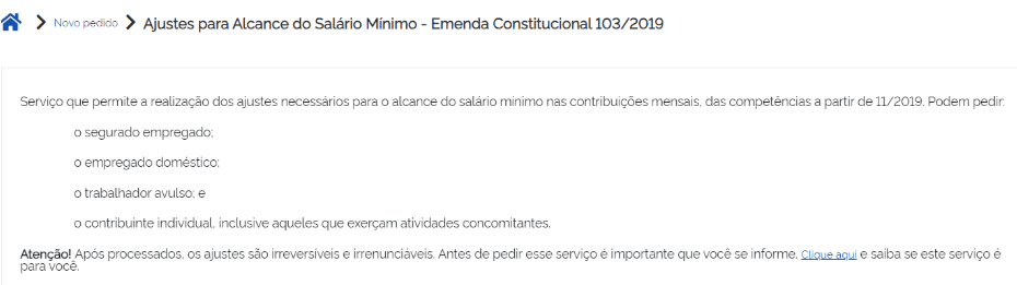 Desde 2019, a complementação foi facilitada, podendo ser solicitada pelo Meu INSS, por meio do serviço “Ajustes para alcance do Salário Mínimo –Emenda Constitucional 103/2019” que permite efetuar os ajustes necessários para o alcance do salário-mínimo nacional que estejam abaixo do salário- mínimo.