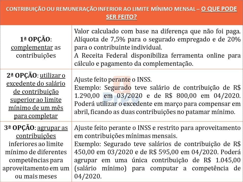 A Portaria nº 450/2020 do INSS é mais restritiva ainda, ao dispor que “a competência cujo recolhimento seja inferior à contribuição mínima mensal não será computada para nenhum fim” (art. 28).