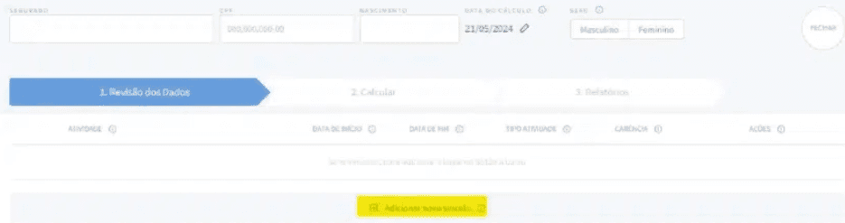 Caso deseje fazer um cálculo manual, ou seja, sem a utilização do CNIS digital, preencha os seus dados pessoais e, após, clique em “Adicionar novo vínculo” para informar as atividades laborativas.