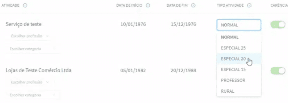 Após, para que o sistema identifique as atividades desenvolvidas, com a aplicação do regramento devido, basta buscar o vínculo desejado e alterar o TIPO DE ATIVIDADE para ESPECIAL, seja, 15, 20 ou 25, de acordo com o labor exercido, ou, ainda, para PROFESSOR ou RURAL, caso aplicável: