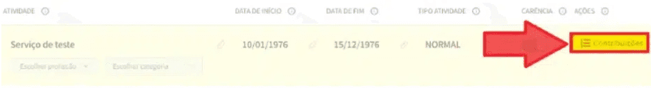 Após, sempre confira e, se necessário, edite manualmente os salários de contribuição em cada um dos vínculos e competências, acessando o botão de “Contribuições”, disponível em cada uma das linhas de atividades lançadas em seu cálculo: