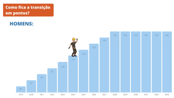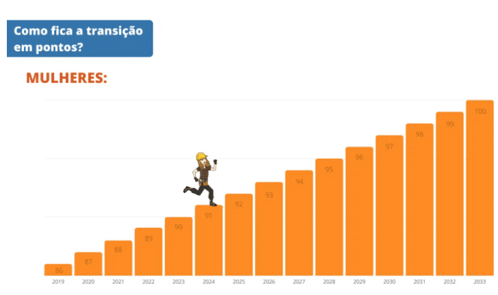 Nesse viés, vale salientar que a pontuação é composta pelo tempo de contribuição + a idade do segurado. Por exemplo, se um segurado possui 45 anos de idade e 30 anos de contribuição, sua pontuação será de 75 pontos.