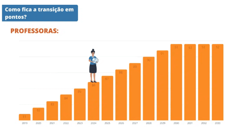 A partir da entrada em vigor da Reforma, passou a exigir também, além do tempo mínimo de magistério, a somatória dos pontos, que, como já citado anteriormente, corresponde à idade + tempo de contribuição do trabalhador.