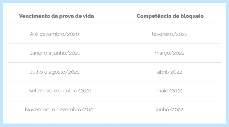 Para os demais aposentados e pensionistas, começou a valer em 2022 a prova de vida no mês do aniversário. O bloqueio para esse grupo, caso deixe de fazer o procedimento, começará a partir de julho. A obrigatoriedade da medida estava suspensa por causa da pandemia de coronavírus e foi retomada por alguns períodos do ano passado.
