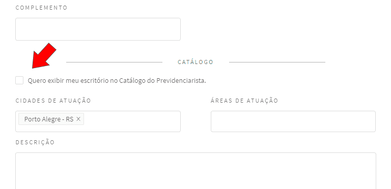 Por isso, caso não queira aparecer no Diretório, basta entrar no seu escritório, em configurações, ir em editar dados do seu escritório e desmarcar a opção: Quero exibir meu escritório no Catálogo do Previdenciarista.