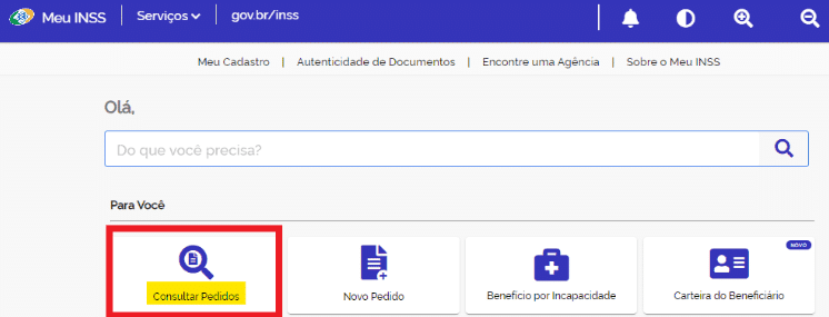 Após realizado o pedido, você pode acompanhar o andamento do requerimento também através do próprio Meu INSS, no botão “Consultar Pedidos”: