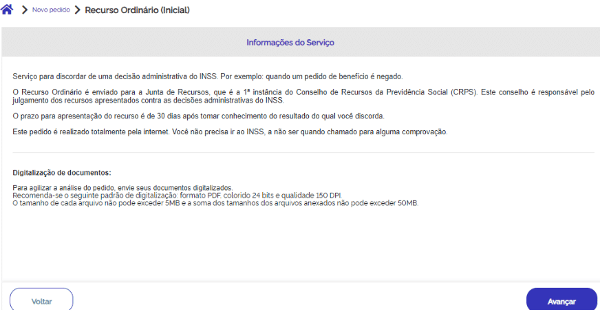 6- Lhe serão prestados alguns esclarecimentos sobre o serviço de recurso. Leia atentamente as informações e clique em “Avançar”;